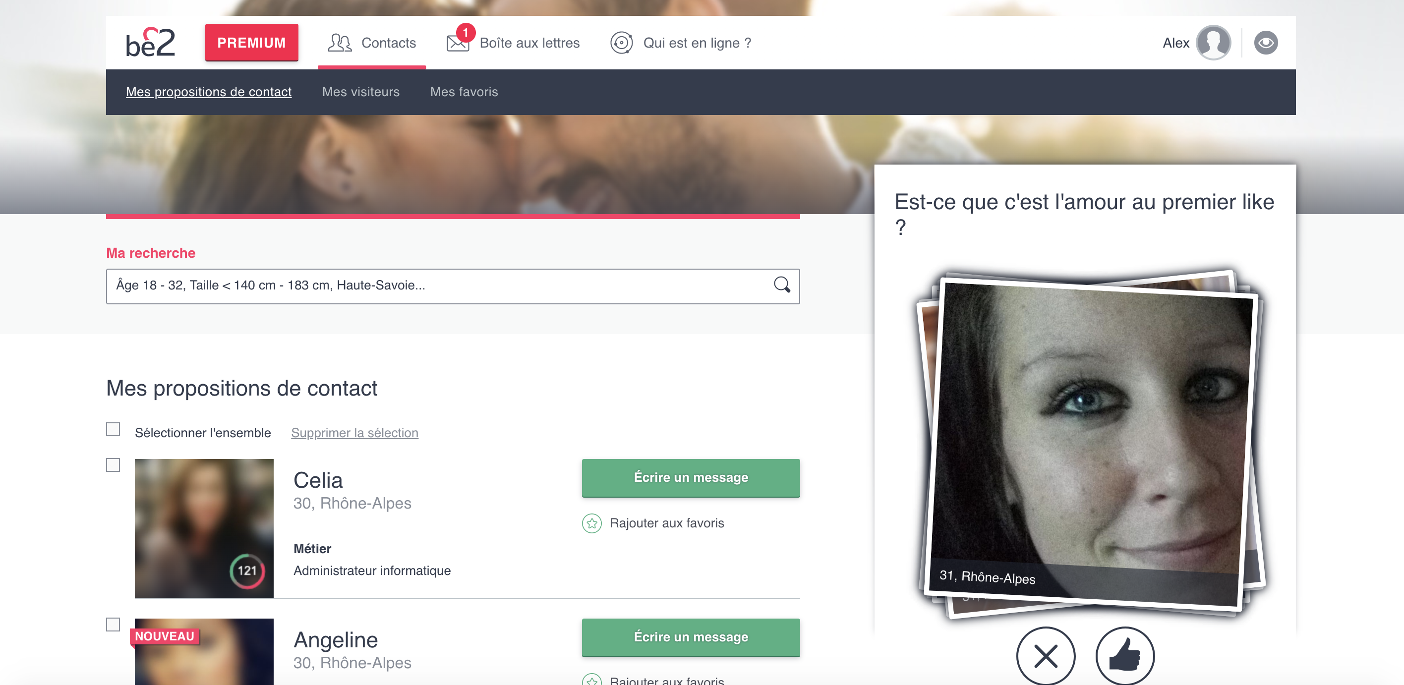 L’offre Premium Be2.fr vous permet de rentrer en contact avec les autres membres du site. Vous pourrez aussi découvrir leur photo et profil complet. Sans l’accès Premium, les fonctions du site sont vites limitées. Alors si vous êtes bel et bien décidé à trouver l’amour et que vous souhaitez rencontrer la personne idéale pour vous, grâce à Be2.fr, vous trouverez sans doute l’histoire de votre vie !