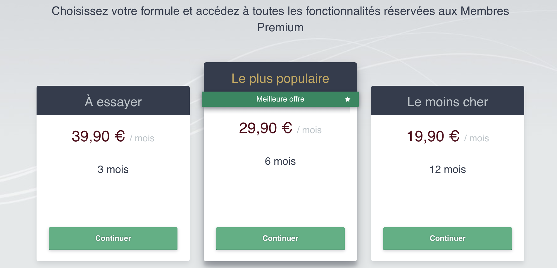 De plus, la possibilité de choisir la durée de l’abonnement Premium vous permettra d’adapter l’offre à votre personnalité. Ainsi, si vous êtes plutôt confiant, l’offre de 3 mois vous permet de prendre contact avec plusieurs personnes tout de suite. Mais si vous préférer prendre votre temps, vous pourrez choisir l’offre 6 mois ou 12 mois, ce qui vous permettra de réduire le montant des mensualités. Et en amour, il faut s’avoir prendre son temps.