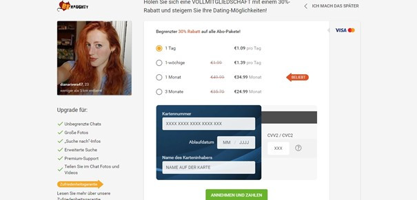 Die Anmeldung auf BeNaughty.com ist kostenlos. Wie bei den meisten eindeutigen Dating-Seiten, muss man ein Abonnement abschließen, wenn man sämtliche Funktionen benutzen und wirklich Erfolg haben will. Nach dem Abschluss eines Abonnements hatten wir Zugang zu: