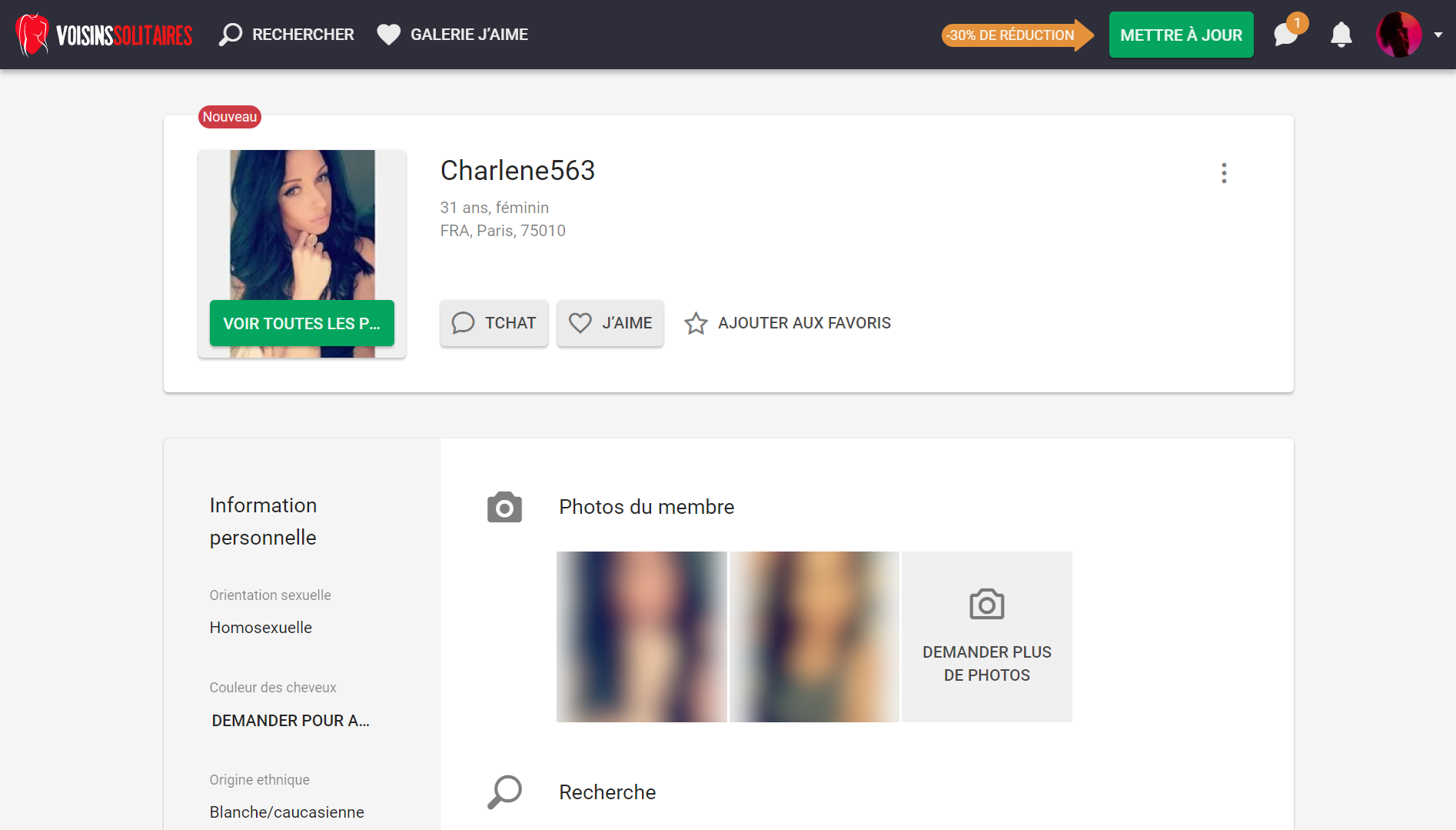 Remplir un profil sur Voisins Solitaires prend peu de temps. Vous y retrouverez cependant tous les critères essentiels qui permettent d’alimenter le moteur de recherche pour obtenir des résultats pertinents. Vous pourrez donc trier vos futures conquêtes avec les traditionnels filtres : âge, sexe, ville, mais aussi par leur orientation sexuelle, leur origine ethnique, leur morphologie, la couleur de leurs cheveux, les couleurs de leurs yeux, s’ils sont ou non percés ou encore s’ils portent des tatouages... Vous pouvez également décider de n’afficher que les profils avec des photos et/ou des vidéos.